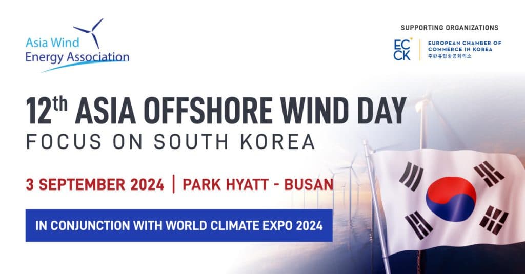 The Asia Wind Energy Association, a valuable partner of the ECCK, is organizing its 12th Asia offshore wind day with Focus on Korea, at the Park Hyatt Hotel in Busan on September 3, 2024. Established in 2016, the Association is leading the way in harnessing wind energy to provide sustainable clean energy across the Asia-Pacific region.