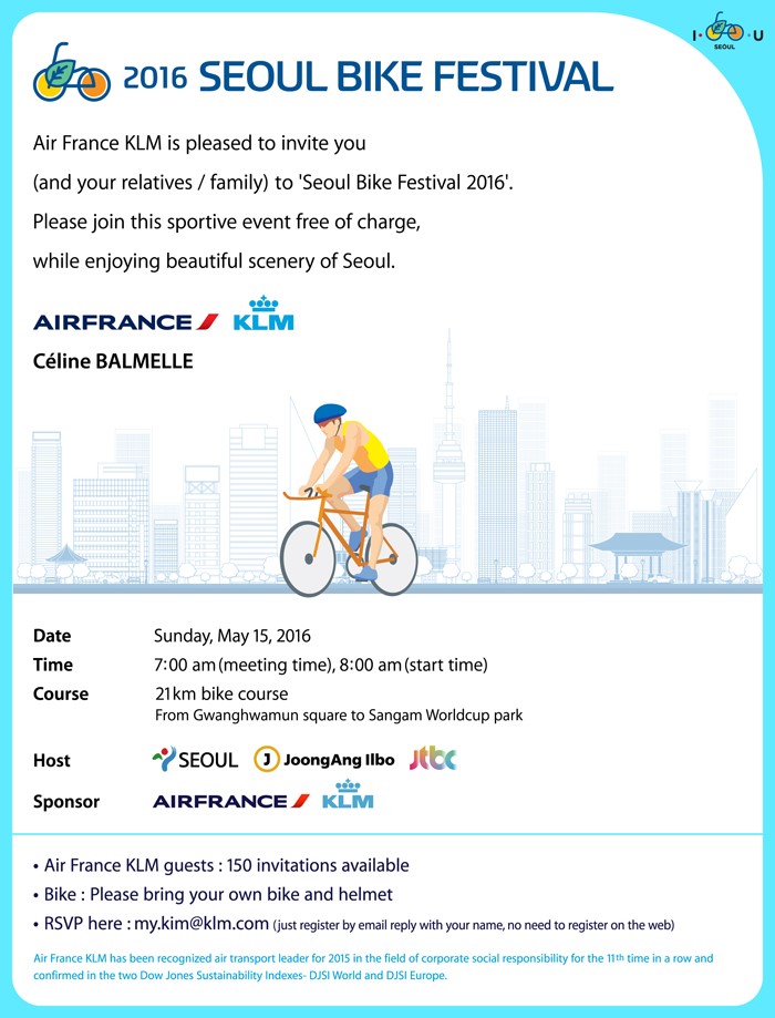 Again this year, Air France KLM in Korea will be sponsor of the 2016 Seoul Bike Festival on May 15. In this Festival, 5000 bikers under the direction of the Major of Seoul will cycle 21 km through the heart of Seoul from Gwanghwamun to the Sangam Worldcup Park.