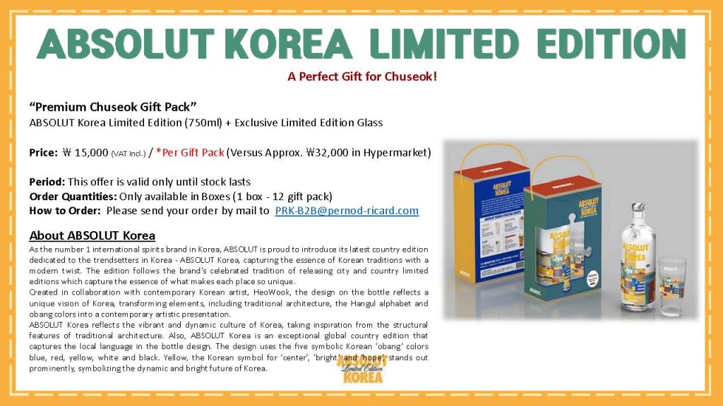 ABSOLUT Korea “Premium Chuseok Gift Pack” ABSOLUT Korea Limited Edition (750ml) + Exclusive Limited Edition Glass Price: KRW 15,000 (VAT incl.) / *Per Gift Pack (versus approx. KRW 32,000 in hypermarket) Contact: PRK-B2B@pernod-ricard.com For details, please click on the following link: ABSOLUT Korea Limited Edition – “Premium Chuseok Gift Pack”