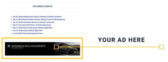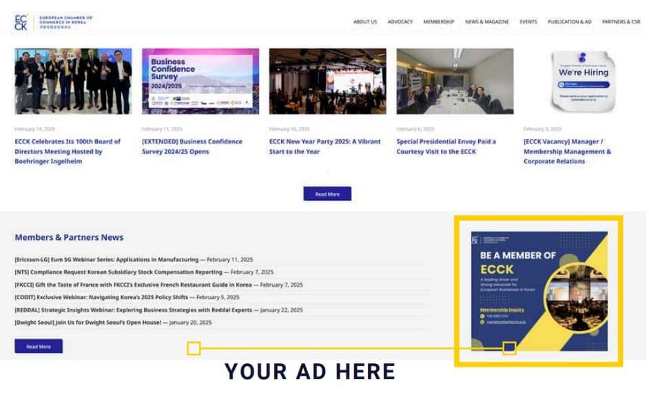 The ECCK’s website is one of the powerful platforms to connect with various audience as it attracts diverse pool of visitors every day. The website AD will be presented in a carousel format and will be located on the mid-right corner of the homepage (ecck.or.kr) to maximize exposure.