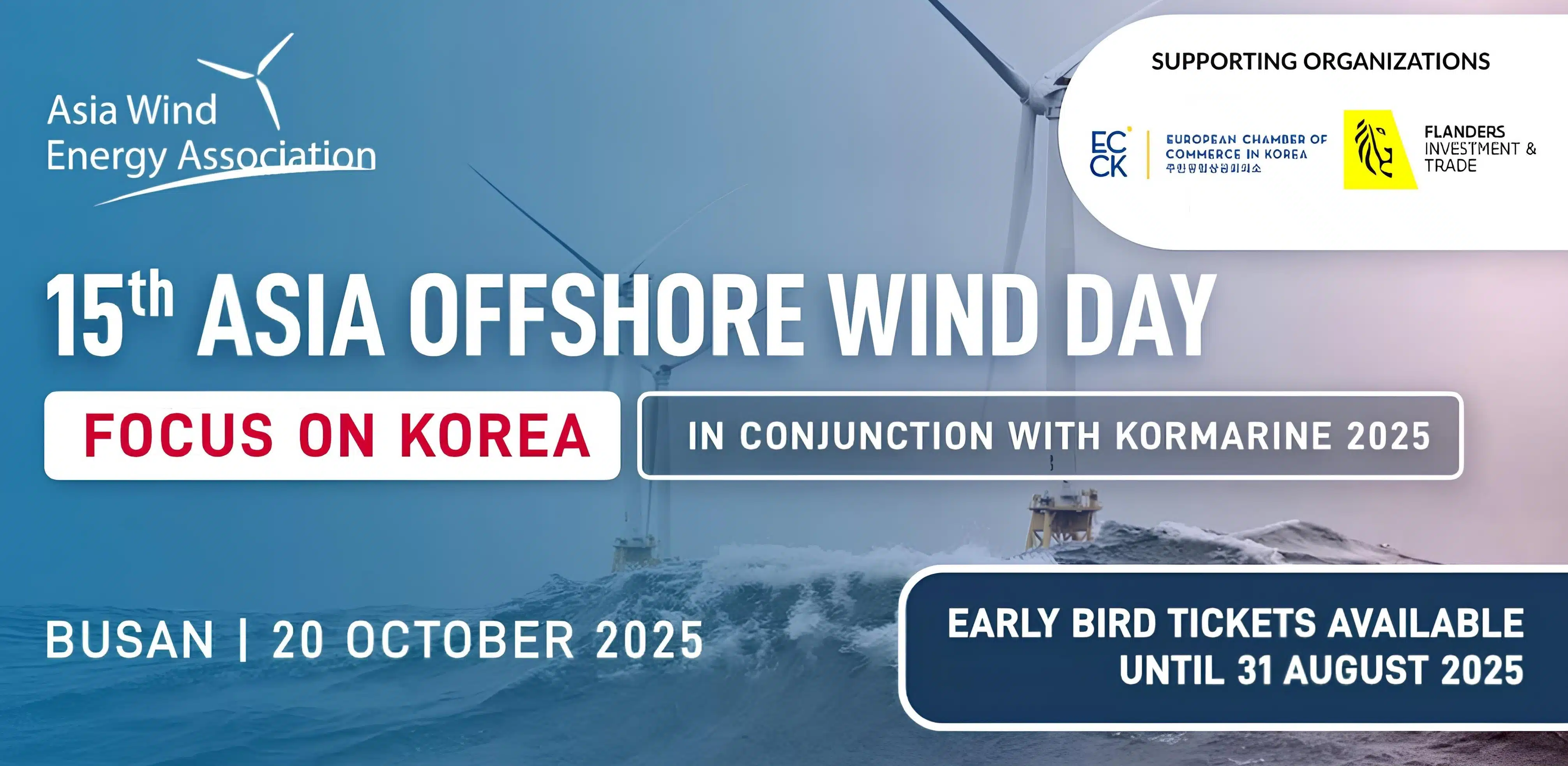 The Asia Wind Energy Association in conjunction with KORMARINE 2025 is organizing the 15th Asia Offshore Wind Day in Busan. The aim of the event is to discuss and learn about the future of the offshore wind sector in Korea through networking opportunities, as it is expected for the wind industry in Korea to grow significantly in the coming years. The conference will also discuss the positions and soties of other markets, such as Taiwan, Japan, India and Australia.