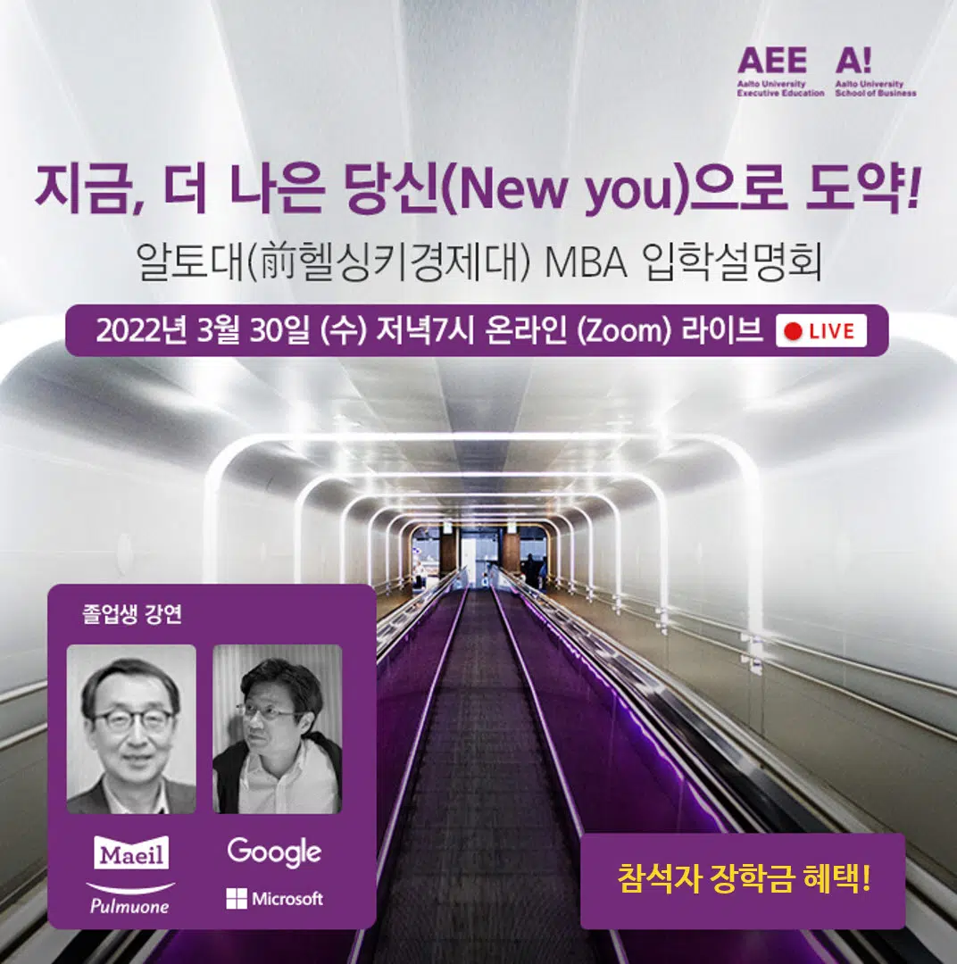 aSSIST(a Seoul School of Integrated Sciences & Technologies, President Dr. Kim Tae-hyun) will hold the INFO SESSION of ‘Aalto Executive MBA in Seoul’ for the fall semester of 2022 at 7 pm on March 30th.