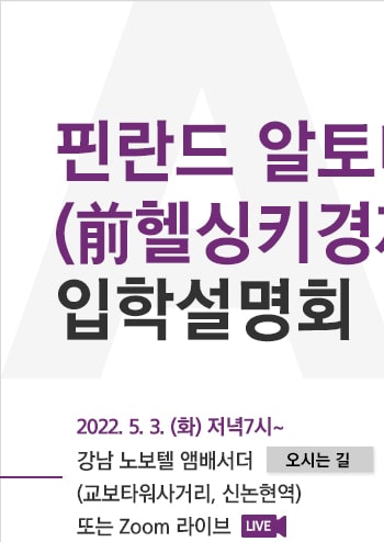 aSSIST(a Seoul School of Integrated Sciences & Technologies, President Dr. Kim Tae-hyun) will hold the INFO SESSION of ‘Aalto Executive MBA(former Helsinki University of Economics) in Seoul’ for the fall semester of 2022 at Novotel Ambassador Gangnam at 7 pm on May 3rd.