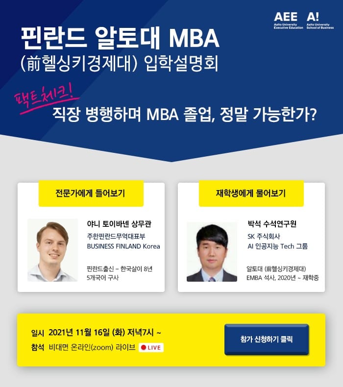 aSSIST(a Seoul School of Integrated Sciences & Technologies, President Kim Tae-hyun) will hold ‘Finland Aalto Executive MBA in Seoul INFO SESSION’ for the spring semester of 2022 at 7 pm on the November 16th.