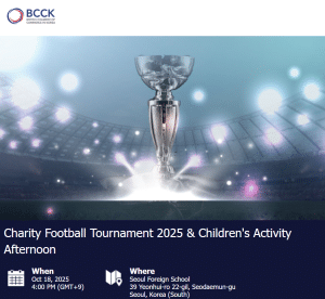 The BCCK invites you or your company to enter a team for the British Chamber of Commerce in Korea (BCCK)’s annual Charity Football Tournament on Saturday, 18 October 2025.