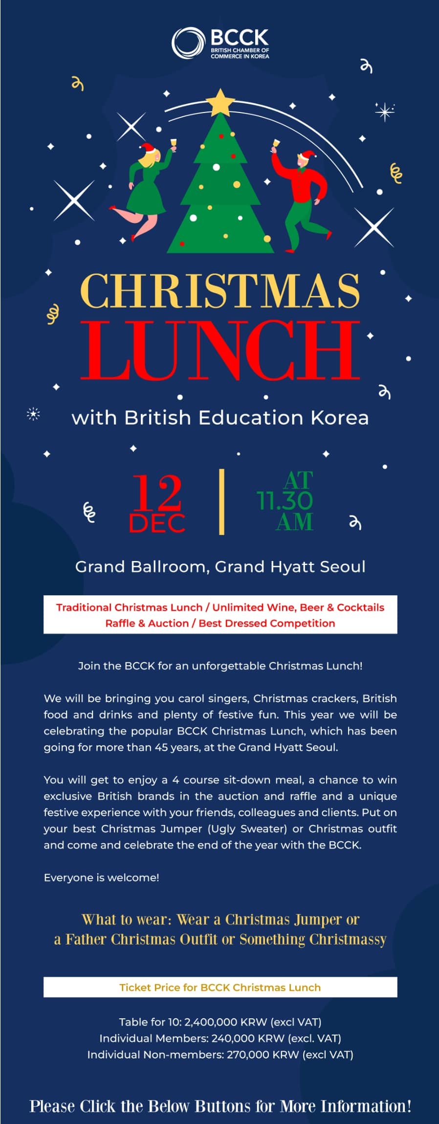 The British Chamber of Commerce in Korea (BCCK) is pleased to invite you to their Christmas Lunch, including unlimited wine, beer, and cocktails, a raffle, an auction and a best dressed competition.