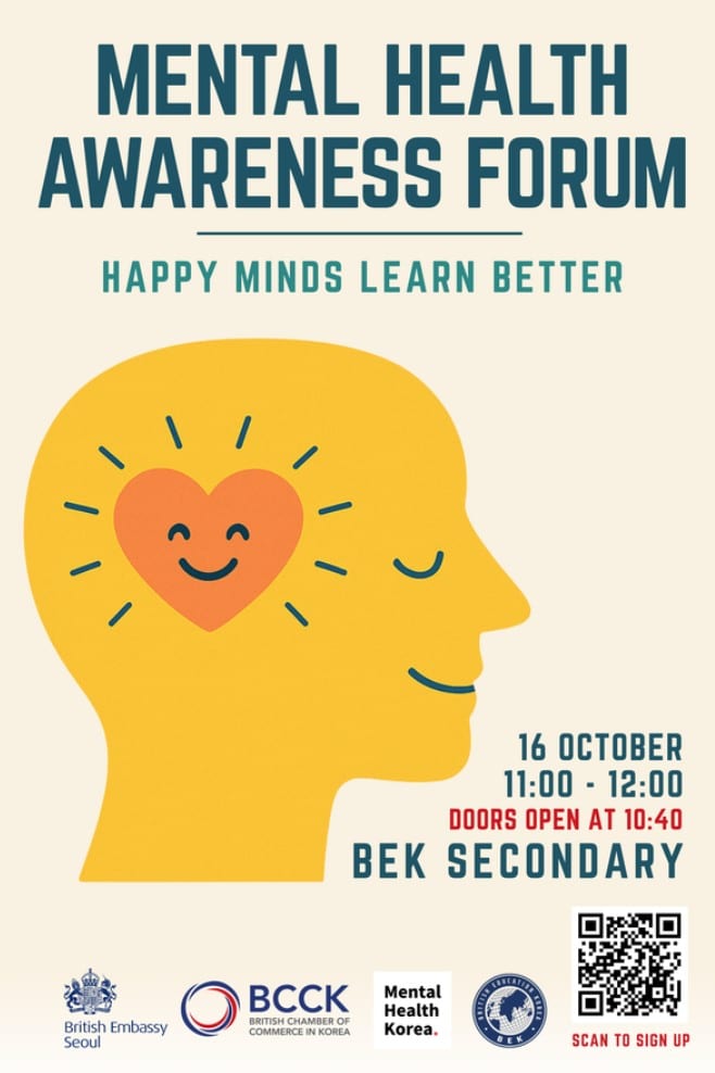 Hosted in partnership with the BCCK, British Embassy Seoul, Mental Health Korea and BEK, this forum event is part of the Mental Health Awareness Week and carries the theme: “Happy Minds Learn Better.”