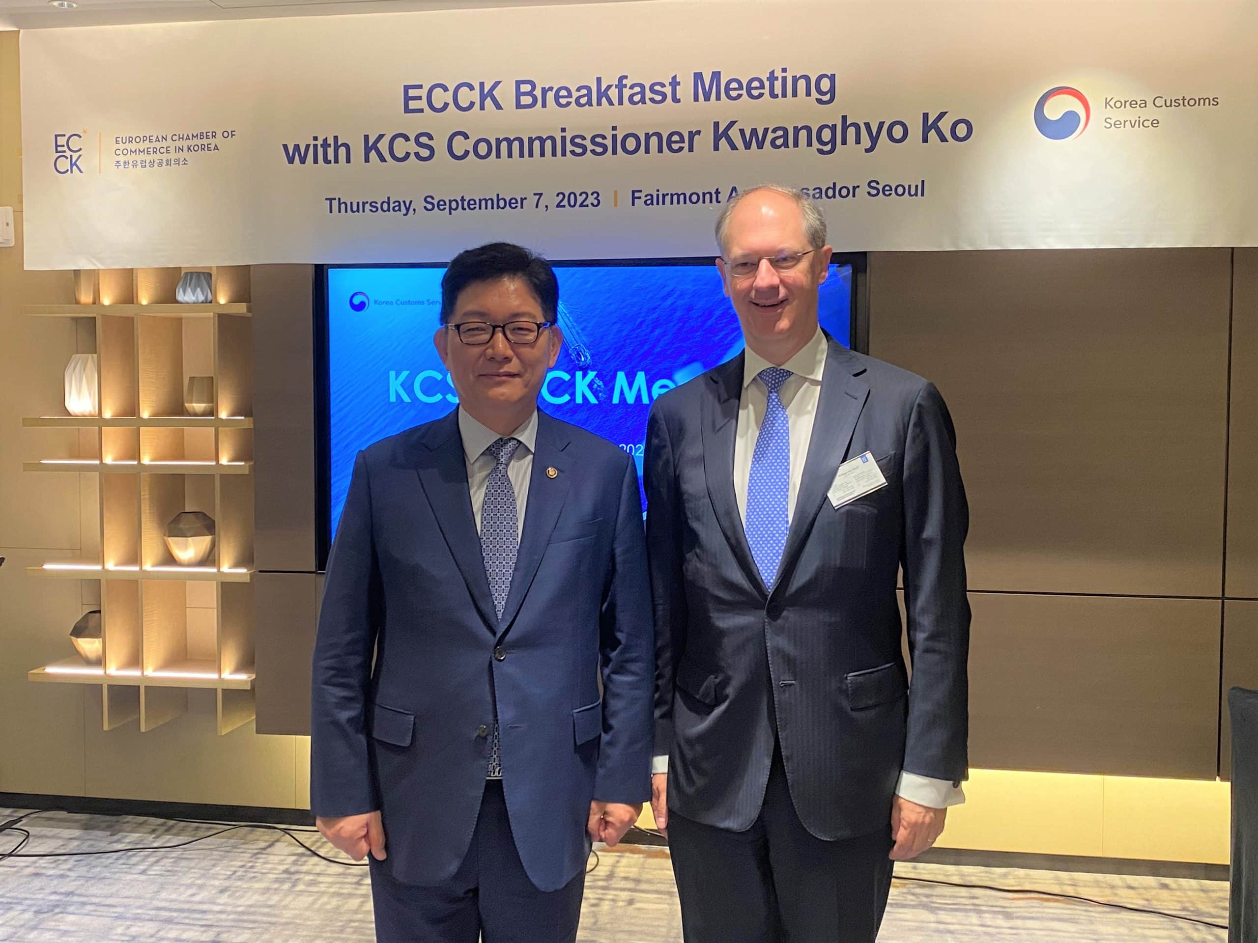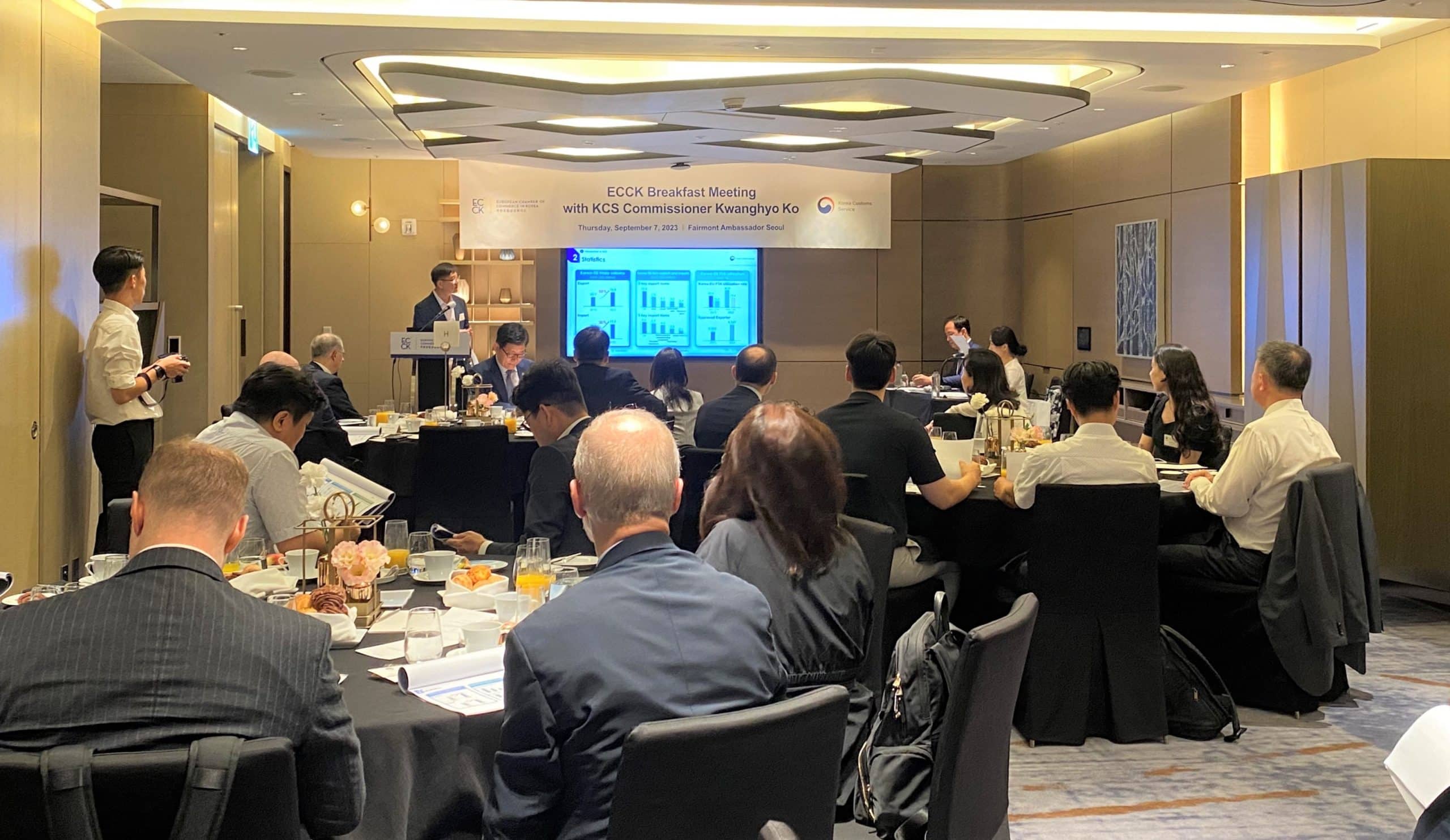 On September 7, 2023, the ECCK held a breakfast meeting with Ko Kwanghyo, Commissioner of the Korea Customs Service (KCS) at Fairmont Ambassador Hotel Seoul with representatives from ECCK members in attendance.