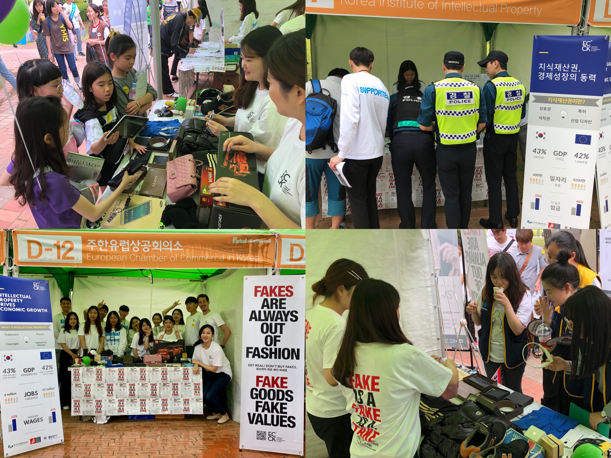 As part of the event, ECCK conducted an IPR campaign to enhance awareness on the economic benefits of intellectual property and displayed a wide range of counterfeit products to inform the public of their negative consequences to society and to individual consumers. The booth attracted a large crowd as ECCK and volunteers explained the dangers of the counterfeit goods, common traits of fake goods, and why intellectual property is a driving force for economic growth. ECCK was supported by the Korean Institute of Intellectual Property, which recently published a study about the economic benefits of IP: https://ecck.or.kr/ip-intensive-industries-have-tangible-impact-on-economy/.