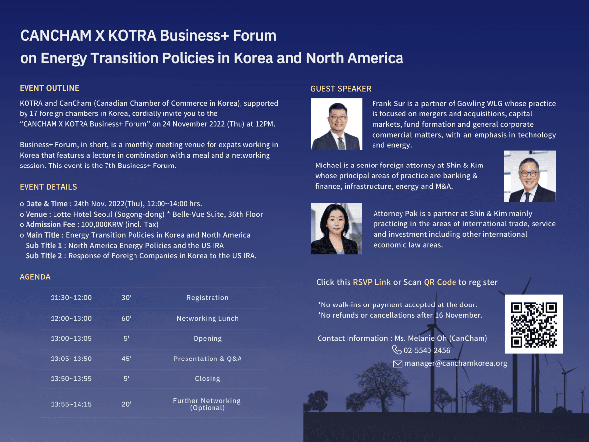 CANCHAM x KOTRA Business+ Forum: Energy Transition Policies in Korea and North America Date & Time: Thursday, November 24, 2022 / 12:00-14:00 Venue: Lotte Hotel Seoul (Sogong-dong) / Belle-Vue Suite, Floor 36 Admission Fee: 100,000KRW (inclusive of tax) Registration Link: CLICK HERE (application deadline: November 16) Contact: CANCHAM at 02-5540-2456 or gro.aerokmahcnac@reganam