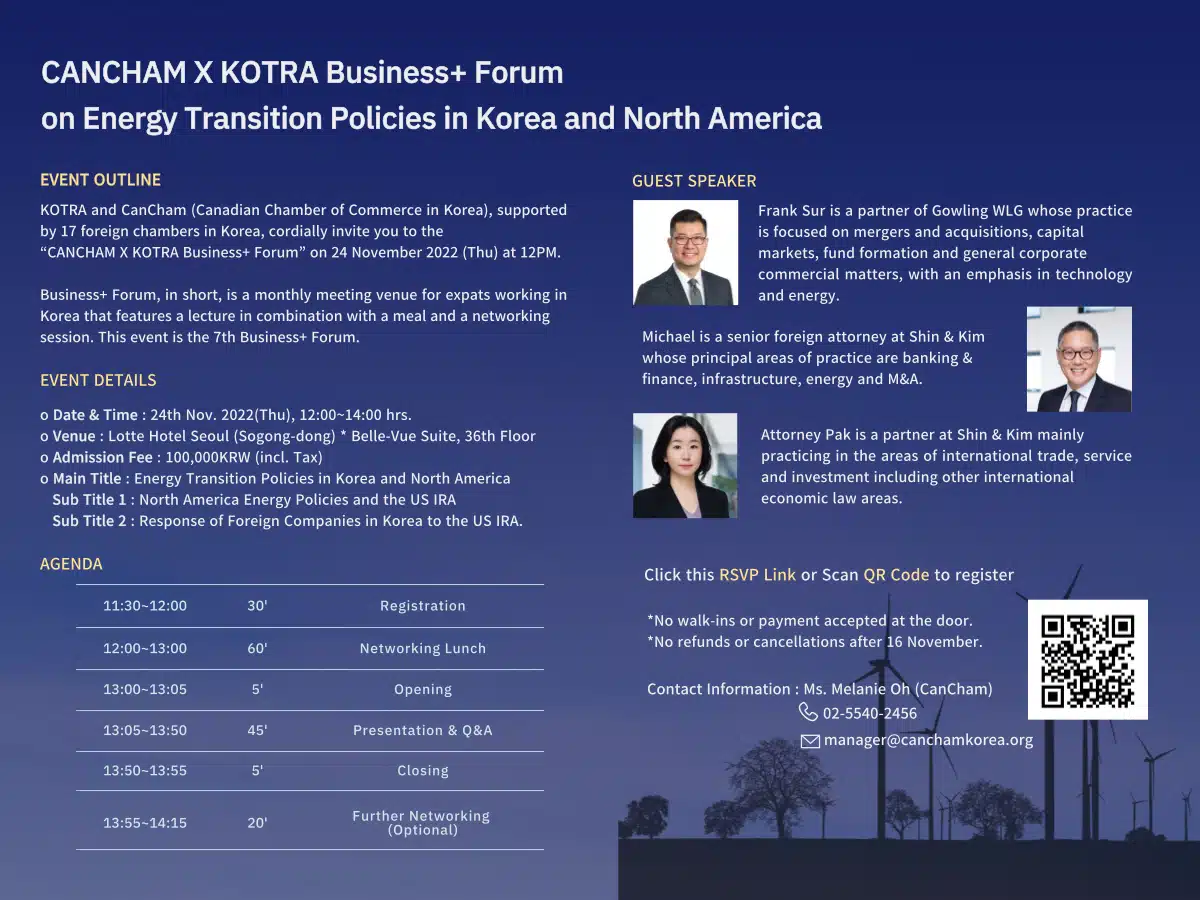 CANCHAM x KOTRA Business+ Forum: Energy Transition Policies in Korea and North America Date & Time: Thursday, November 24, 2022 / 12:00-14:00 Venue: Lotte Hotel Seoul (Sogong-dong) / Belle-Vue Suite, Floor 36 Admission Fee: 100,000KRW (inclusive of tax) Registration Link: CLICK HERE (application deadline: November 16) Contact: CANCHAM at 02-5540-2456 or manager@canchamkorea.org