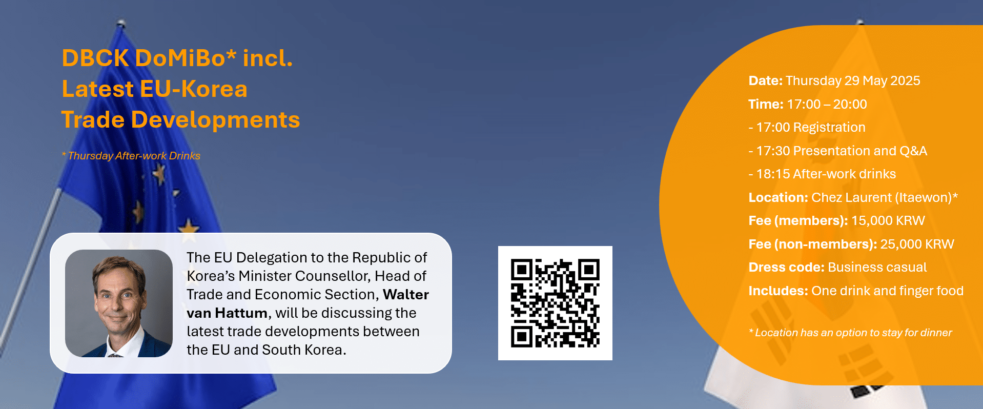 Register here to join DBCK for the after-work drinks: DBCK DoMiBo incl. EU-Korea Trade Developments
