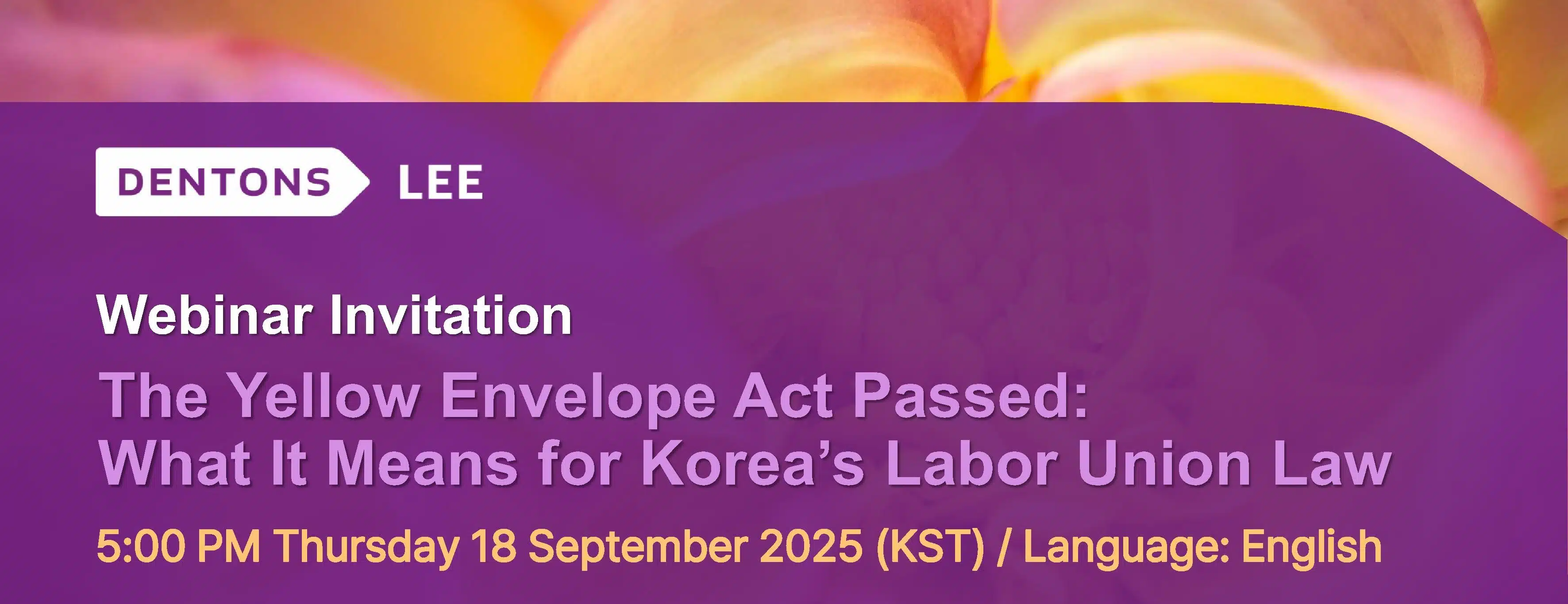 Dentons LEE would like to invite you to their webinar session on “The Yellow Envelope Act Passed: What It Means for Korea’s Labor Union Law”. The approval of the long-debated reform of the “Yellow Envelope Act” could significantly impact the environment of labor relations within companies. This webinar aims at discussing what this Act actually is and why it matters for employers, as well as comparison of Korea’s distinctive labor union law and global standards.