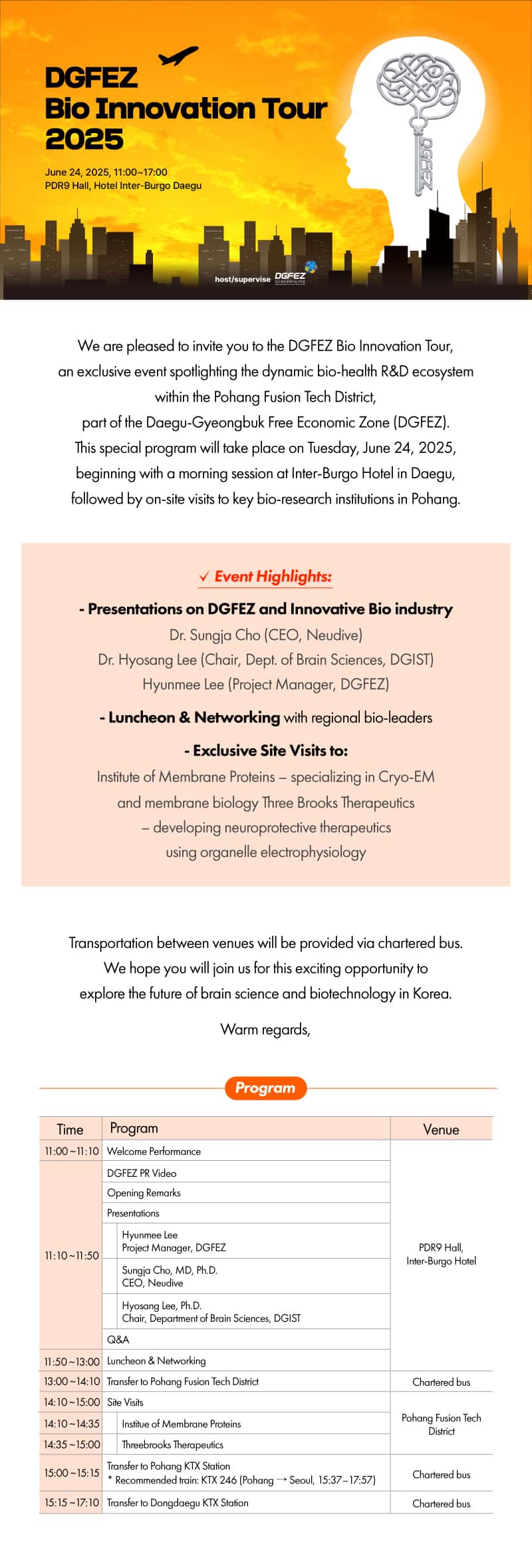 Daegu-Gyeongbuk Free Economic Zone (DGFEZ) is pleased to invite you to the DGFEZ Bio Innovation Tour to join to this exclusive event spotlighting the dynamic bio-health R&D ecosystem within the Pohang Fusion Tech District. The program will feature presentations on DGFEZ and innovative bio industry, meaningful networking opportunities with regional bio-leaders. Participants will also be able to join exclusive visits to the Institute of Membrane Proteins specializing in Cryo-EM and membrane biology, and the Three Brooks Therapeutics developing neuroprotective therapeutics using organelle electrophysiology.