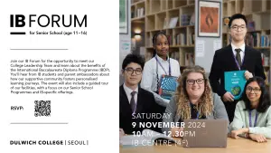 Join the IB Forum organised by ECCK member Dulwich College Seoul for students aged 11 to 16. This is an opportunity to meet the College Leadership Team and learn about the benefits of the International Baccalaureate Diploma Programme (IBDP). Attendees will hear from IB students and parent ambassadors about how the Dulwich community fosters personalised learning journeys. The event will also include a guided tour of our facilities, with a focus on our Senior School Programmes and IB-specific offerings.
