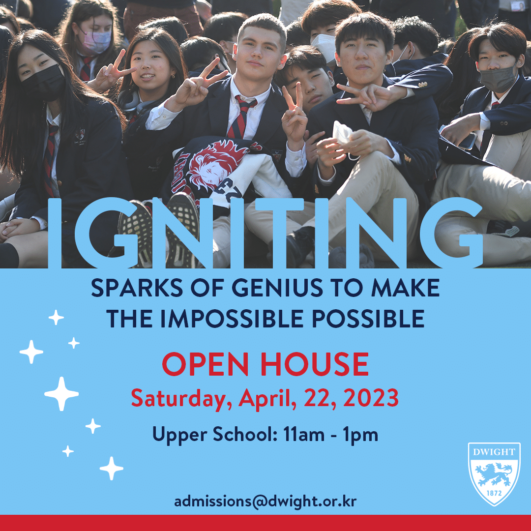 Please join us for our Spring Open House on Saturday, April 22. It is a great opportunity to learn about Dwight’s IB Programme from our faculty and administrators and also visit our newly renovated library, Spark of Genius Center. We look forward to seeing you. Please click here to register.