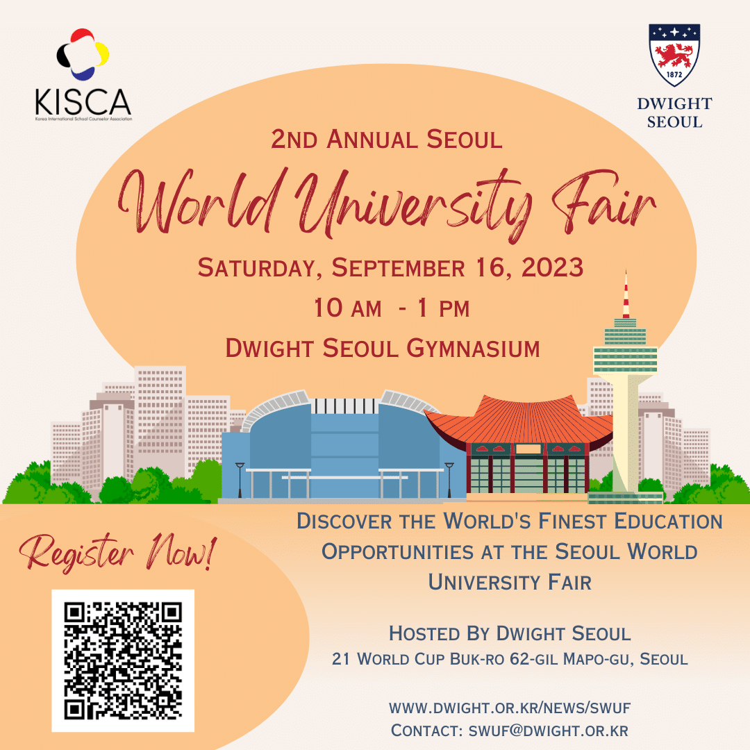 Dwight Seoul is pleased to announce the 2nd Annual Seoul World University Fair will be hosted by the school on Saturday, September 16, 2023. Over 90 world-class institutions representing 17 countries will be present, including universities from the United States, Canada, Germany, China, Hong Kong SAR, Singapore, Canada.