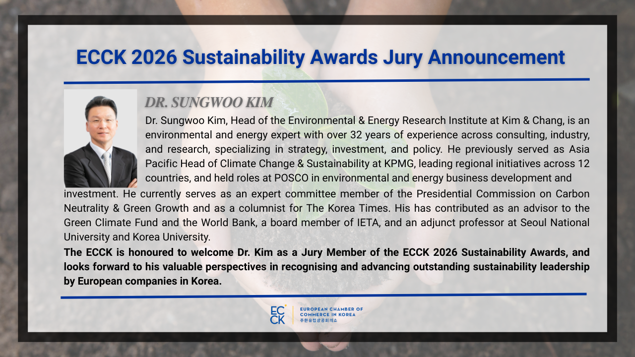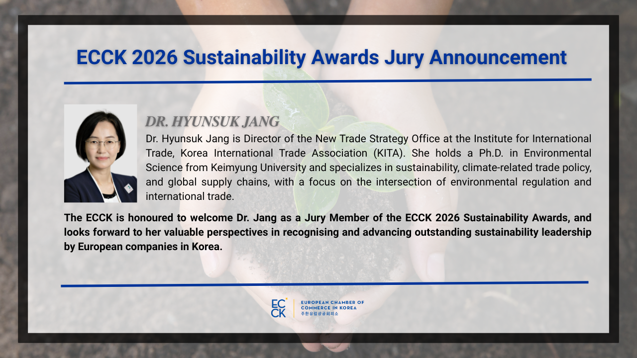 The European Chamber of Commerce in Korea (ECCK), in partnership with Deloitte, is pleased tointroduce the distinguished Jury Panel for the ECCK 2026 Sustainability Awards. As of now, the final four jury members have been confirmed, including Dr. Hyunsuk Jang and Dr. Sungwoo Kim.