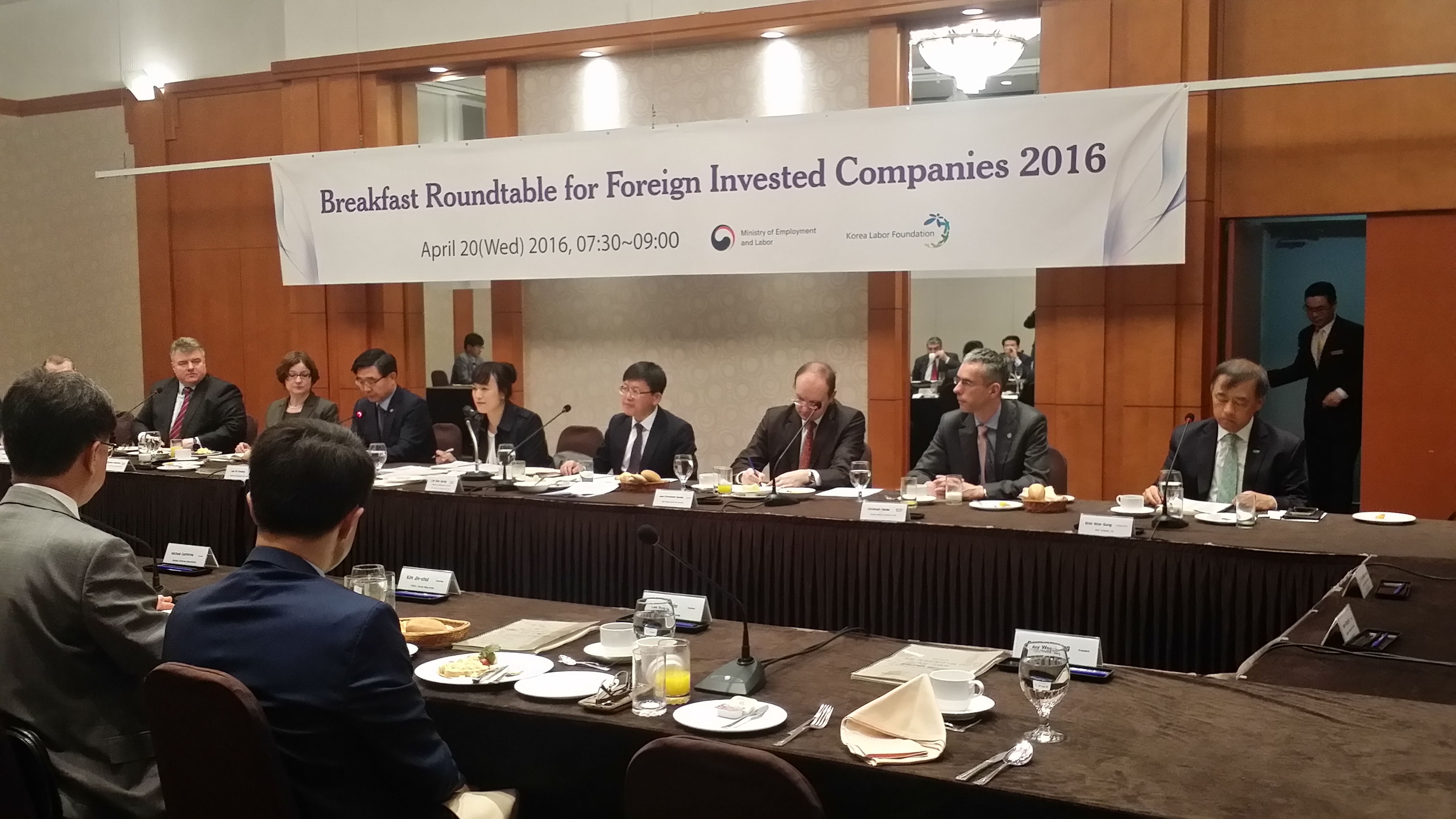This morning on April 20, Minister of Ministry of Employment and Labour hosted a breakfast round table with representatives of foreign chambers and companies. The ECCK attended this meeting that updated the participants on the five major labor regulations and two grand guidelines as well as foreign direct investment (FDI) companies’ grievances.