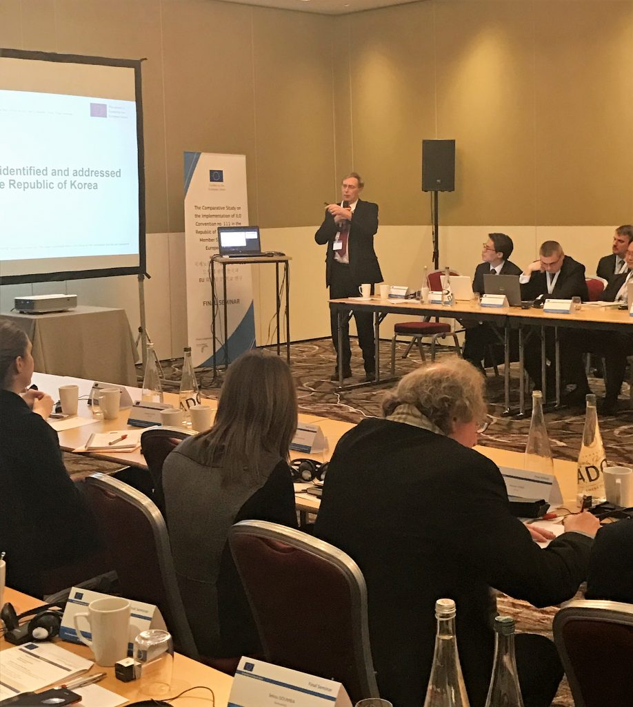 The seminar on workplace discrimination in respect of employment and occupation (ILO 111) in EU Member States & The Republic of Korea was held on March 23, 2017 in Brussels. Tony Michell, the project expert, led the final seminar and shared the outcome to representatives from the European Commission, the Korean government, members of the European Domestic Advisory Group as well as other stakeholders. Christoph Heider, President of the ECCK, participated in his role as a member of the European Domestic Advisory Group. The seminar also included an open interview with the International Labour Organization (ILO). The International Labour Organization is a United Nations agency dealing with labour issues, particularly international labour standards, social protection, and work opportunities.