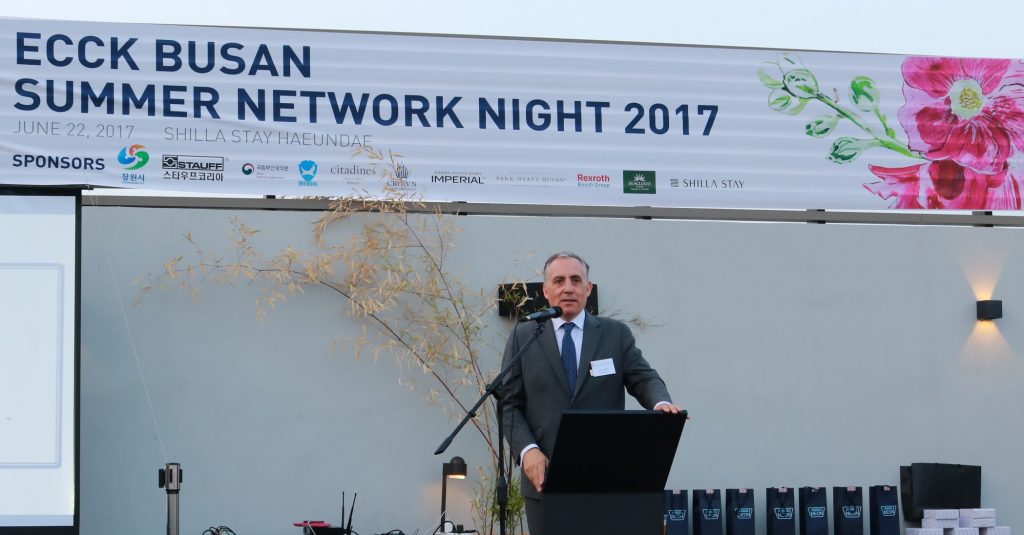 On June 22, the ECCK Busan chapter held ‘ECCK Busan Summer Network Night 2017’ on the rooftop of Shilla Stay Haeundae. The networking event opened with welcome remarks by the Marine & Shipbuilding Committee Chairman Mr Alfonso Cebollero, followed by remarks from our Emerald sponsors, Changwon City and STAUFF Korea. At the event, we also had an opportunity to hear from Mr Song Sungjae, Directoral General of Changwon City, about the investment environment and opportunities of Changwon City. The participants were able to enjoy a performance by Saxophonist Willy J, varied types of Scottish craft beer from Brewdog, and prizes from lucky draw throughout the evening. We would like to thank everyone who attended the network night and our sponsors for making the evening extra special.
