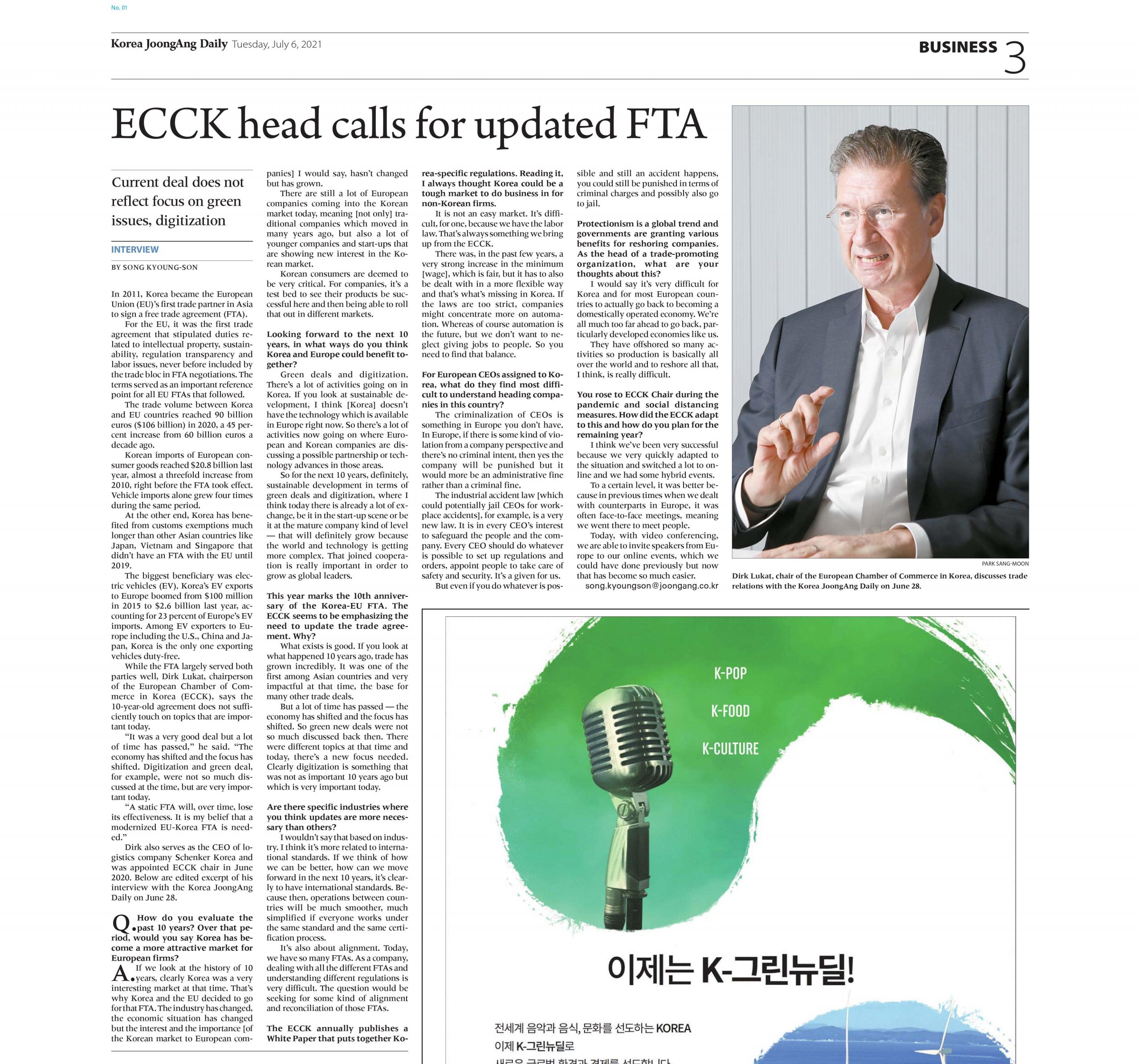 An interview article with ECCK Chairperson Dirk Lukat was published in Korea JoongAng Daily on July 6. In the interview, Chairperson Lukat evaluates the trade relation between EU and Korea in the past 10 years and discusses the necessity to update the EU-Korea FTA.