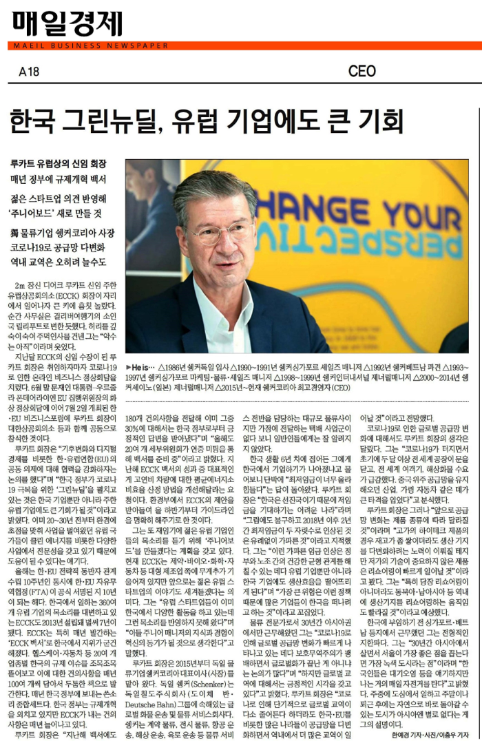 Link to the article: [Maeil Business Newspaper] CEO: 루카트 유럽상의 신임 회장, 한국 그린뉴딜…유럽 기업에도 큰 기회