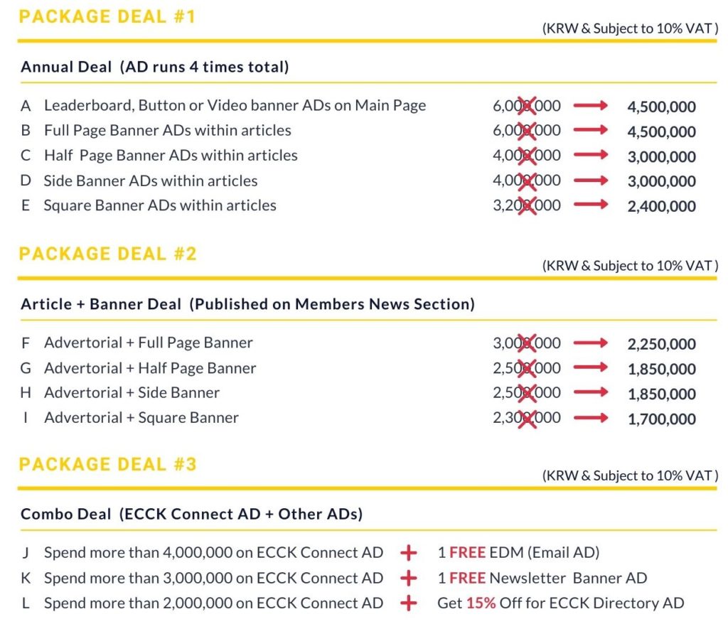If you are interested in running ADs with ECCK, contact Ms. So Hyeun Cho (E: sohyeun.cho@ecck.or.kr / T: +82.2.6261.2714). We look forward to hearing back from you!