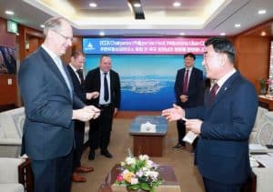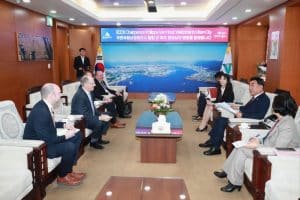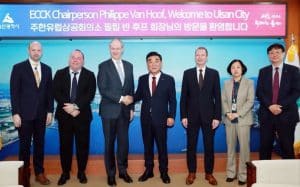 This morning, the ECCK, including Chairperson Philippe Van Hoof, President Stefan Ernst, Board Member/ER Marine CEO Erik Roelans, and Busan Chapter Representative Andrew Millard, had the honor of visiting the Mayor of Ulsan Metropolitan City and his team. Mayor Kim Doo-gyum was very welcoming and took the time to explain about Ulsan and its incentives for foreign businesses, as well as his future plans. Ulsan has already established itself as a major hub for numerous industries, and it is now positioning itself to be a central player in Korea’s transition to renewable energies, a transition the ECCK hopes to facilitate by encouraging and supporting more European companies based in Korea. We extend our thanks to the team at Ulsan Metropolitan City for organizing the meeting for ECCK.