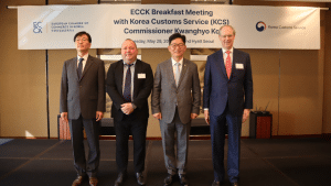 On May 28, ECCK hosted a Breakfast Meeting with Korea Customs Service (KCS) Commissioner Ko Kwanghyo, an expert with extensive experience in finance and policy coordination. During the meeting, KCS shared updates on their current initiatives in ‘regulatory innovation,’ aimed at overhauling unnecessary regulations, and ‘digital innovation’ in customs administration, incorporating new technologies such as business automation and AI in line with the EU-Korea Digital Trade Agreement.