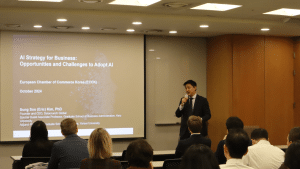 On October 22, the European Chamber of Commerce in Korea (ECCK) hosted an Information Session on the topic “AI Strategy for Business: Opportunities and Challenges to Adopt AI.” The session began with an opening by Jean-Michel Feder from the ECCK’s Digital Committee, followed by an insightful presentation from Dr. Sung Soo (Eric) Kim, Founder and CEO of Datacrunch Global, Special Guest Associate Professor at the Graduate School of Business Administration, Keio University, and Adjunct Professor at the Graduate School of Business, Yonsei University. Dr. Kim outlined the overall trajectory of AI development, its current direction, and the key considerations for successfully integrating AI into business. The session was filled with practical insights, and participants actively exchanged views, reflecting their strong interest in AI.
