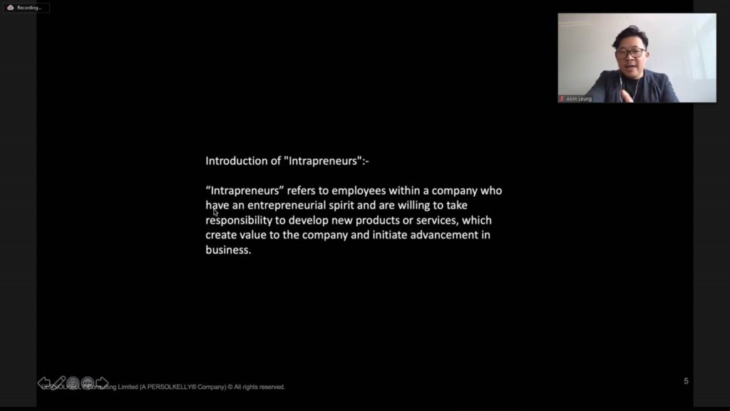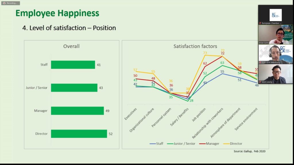 On September 22 ECCK organized a webinar for its HR Forum on Driving Employee Happiness in the New Normal. During this webinar Mr. Brian Sohn, Sales & Marketing Manager at PERSOLKELLY Korea, presented the findings of their Asia-wide survey on workplaces. This was followed by an insightful presentation by Mr. Alvin Leung, General Manager at PERSOLKELLY Hong Kong and Director of its Learning Academy, on driving ‘intrapreneurship’ amongst employees and the concept of ‘Creating Shared Value’ in order to adopt a business model to address a social problem.