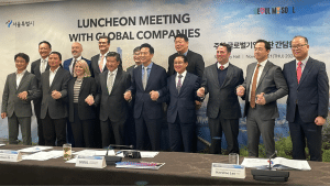 On November 21, ECCK Vice President Bo Sun Kim and Advocacy Event Manager Jeonghyun Lee attended a business luncheon with global companies and Seoul Mayor Oh Se-hoon at Seoul City Hall. During the event, Mayor Oh introduced the Development Vision and Strategy for the Yongsan International Business District, outlining plans to transform Yongsan into a premier destination for multinational companies.