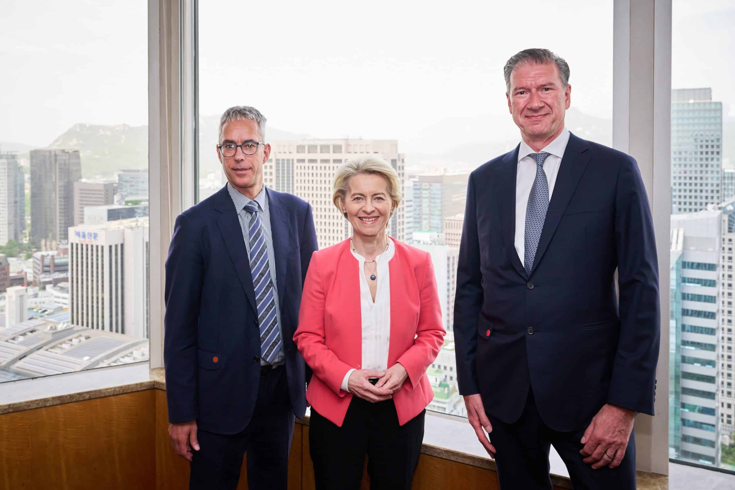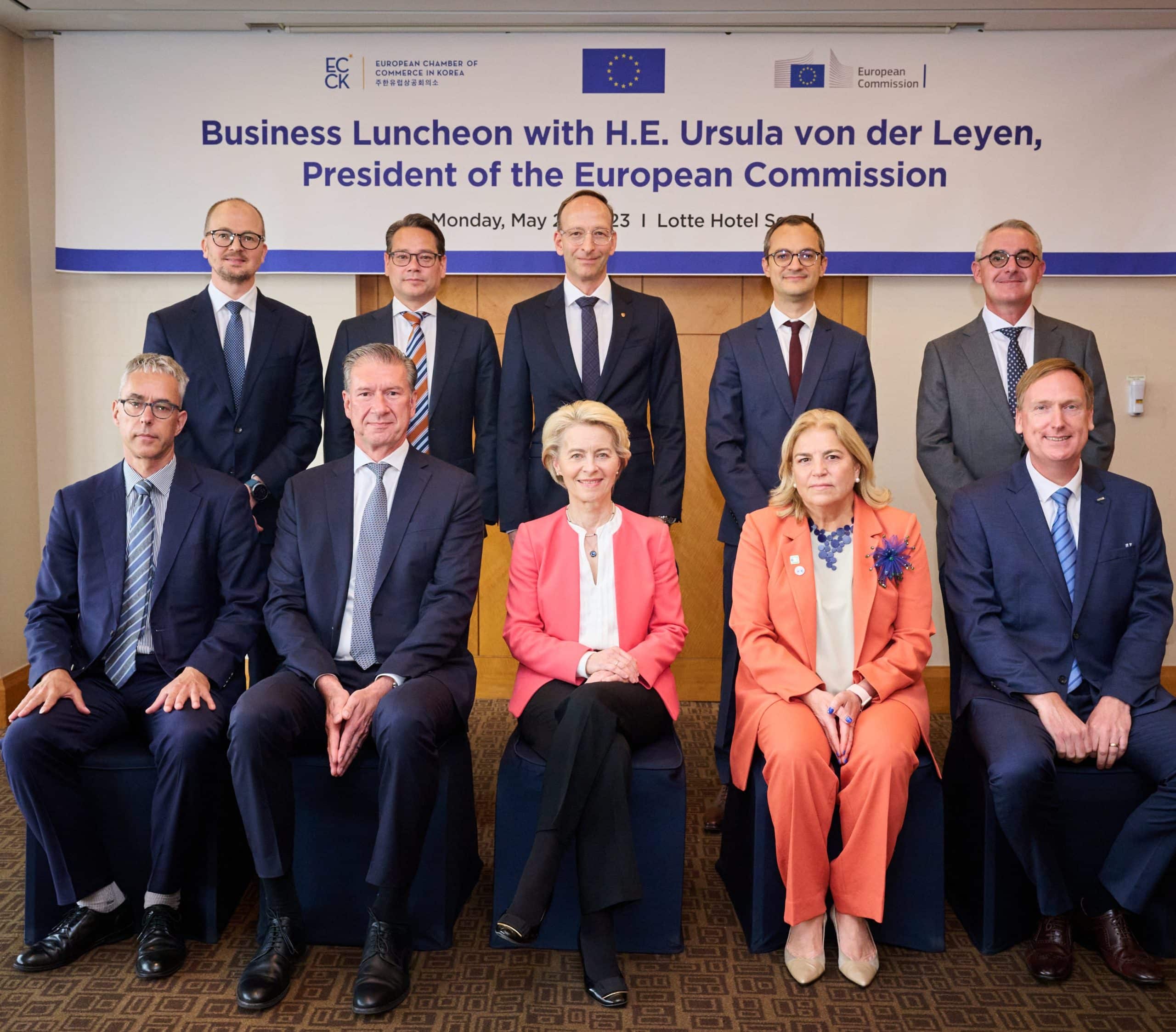 European Commission President Ursula von der Leyen, EU Ambassador to Korea Maria Castillo-Fernandez, ECCK Chairperson and President with representatives from ECCK members Airbus, Air Liquide, ASML, Copenhagen Offshore Partners, Ericsson-LG, and Porsche.