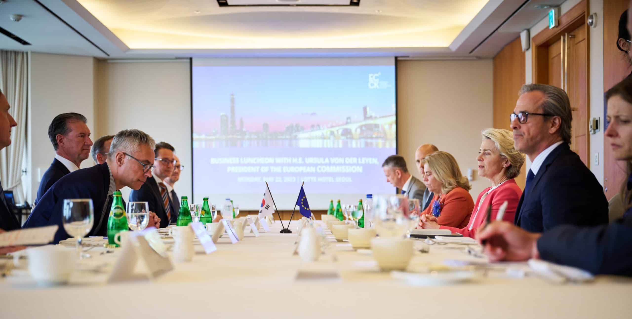 On May 22, the ECCK welcomed European Commission President Ursula von der Leyen to a luncheon meeting prior to her meeting with the Korean leadership at the EU-Republic of Korea summit which happened later that afternoon. ECCK Chairperson Dirk Lukat and President Christoph Heider were joined by EU Ambassador to Korea Maria Castillo-Fernandez, and representatives from ECCK members: Airbus, Air Liquide, ASML, Copenhagen Offshore Partners, Ericsson-LG, and Porsche.