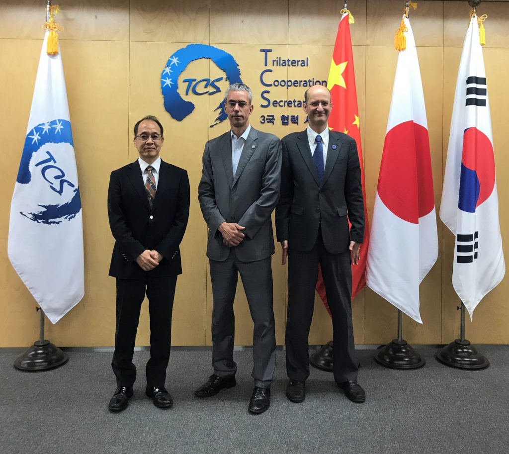 On May 24, Christoph Heider, President of the ECCK, met with Professor Emanuel Pastreich, Founder and Director of the Asia Institute and Mr Akima Umezawa, the Deputy Secretary-General of the Trilateral Cooperation Secretariat (TCS). The TCS is an international organization established with a vision to promote peace and common prosperity among China, Japan, and South Korea. Upon the agreement signed and ratified by each of the three governments, the TCS was officially inaugurated in Seoul in September 2011.