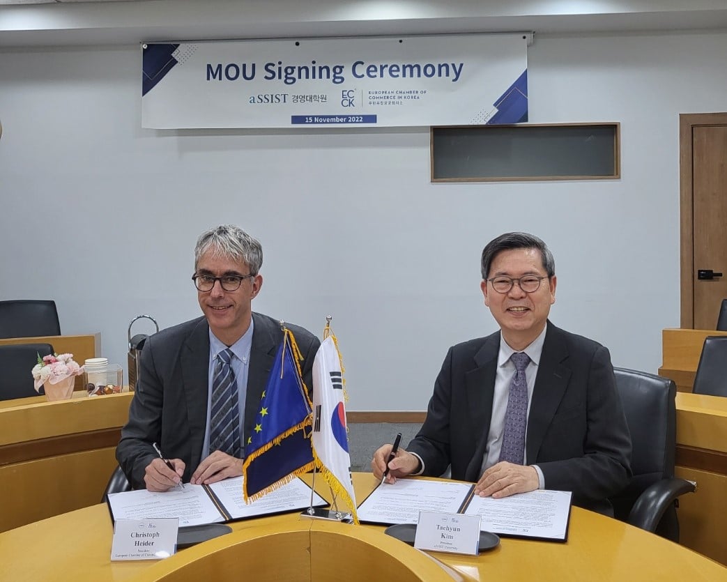 ECCK signed a Memorandum of Understanding (MoU) with Seoul School of Integrated Sciences & Technologies (aSSIST University) with the aim of offering personal development and training modules to ECCK member companies. ECCK and aSSIST University will collaborate to provide ECCK members with various informative training modules at discounted rates. Plus, if an individual student enters aSSIST University through ECCK, the admission fee of 700,000 KRW will be covered by aSSIST University.