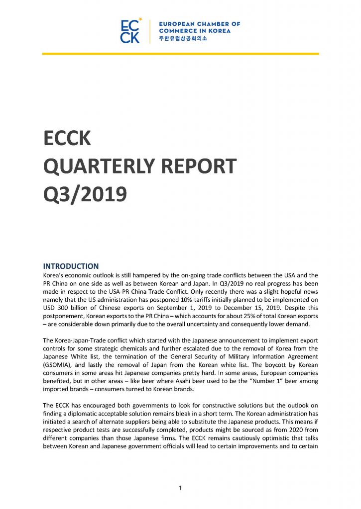 As true European advocacy organization we have included information about EU and EFTA countries’ trade for H1 2019 (information always being delayed by one quarter) and EU and EFTA FDI in Korea for Q3 2019. The purpose of the report is to provide a succinct overview of the most pertinent developments for European industry in Korea.