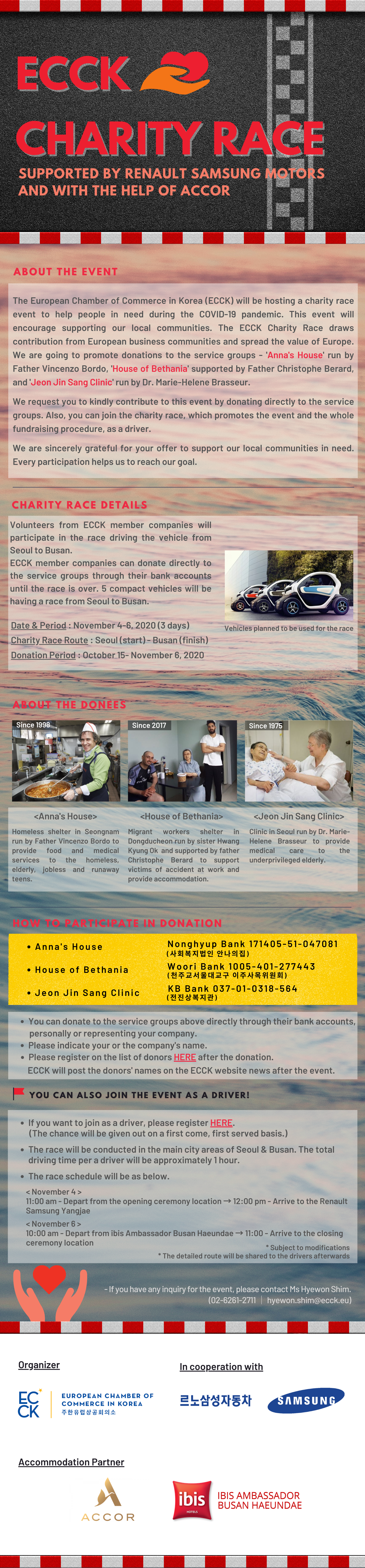 This event will encourage supporting our local communities. The ECCK Charity Race draws contribution from European business communities and spread the value of Europe. We are going to promote donations to the service groups – ‘Anna’s House’ run by Father Vincenzo Bordo, ‘House of Bethania’ supported by Father Christophe Berard, and ‘Jeon Jin Sang Clinic’ run by Dr. Marie-Helene Brasseur.