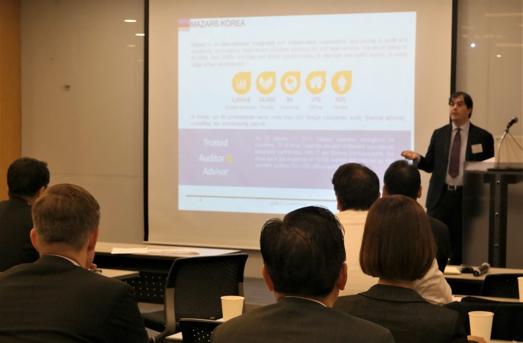 On October 18, ECCK held an information session with Mazars Korea, under the theme of “What CEOs and CFOs need to know about tax, accounting and internal control in Korea”. Joined by over 20 CEOs and CFOs from ECCK member companies including European firms and embassies in Korea, the event consisted of presentations by accounting and financial advisory experts, Mr Seung-Ha Park (CEO of Mazars Korea) and Mr Julien Herveau (Partner/Managing Director of Mazars Korea). The ECCK would like to thank Mazars Korea and all members for their participation. We hope to see everyone at the next ECCK event.