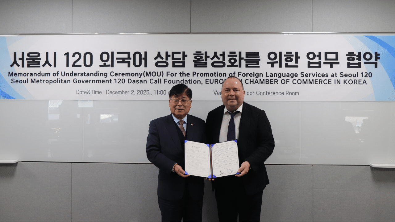 On December 2, Stefan Ernst, President of the European Chamber of Commerce in Korea (ECCK), met with Lee Lee-jae, President of the 120 Dasan Call Foundation, to sign a Memorandum of Understanding aimed at promoting the Foundation’s foreign-language services to ECCK member companies.