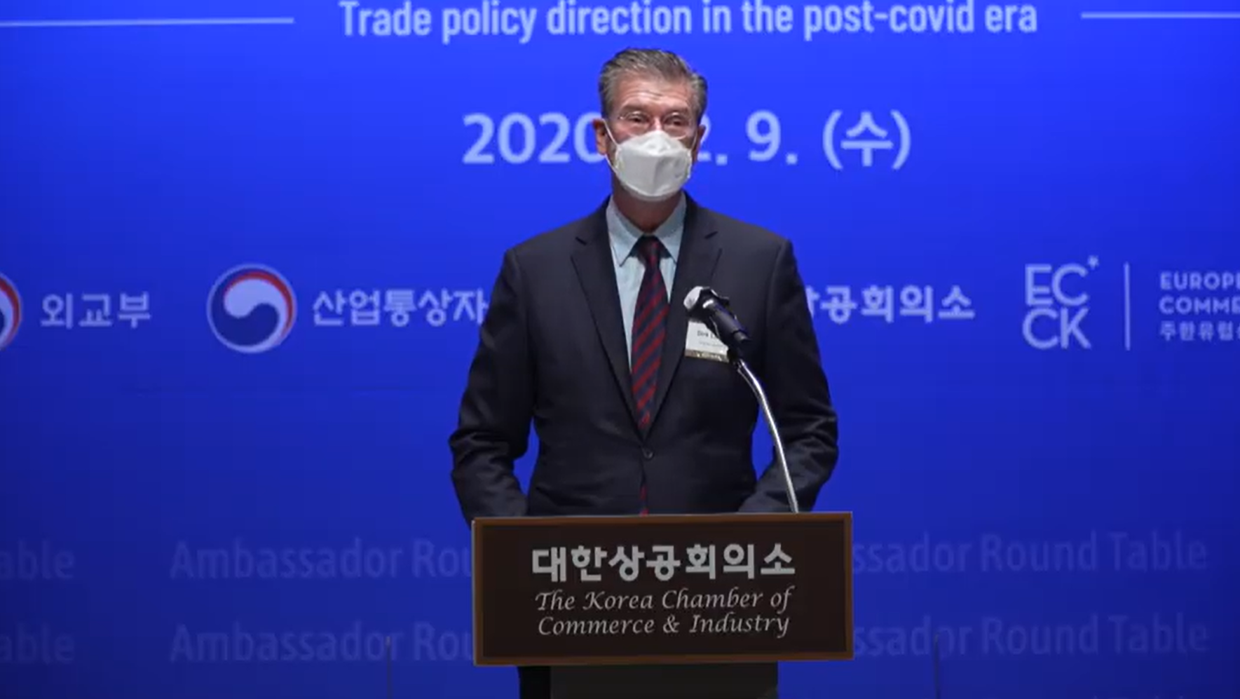 ECCK Chairperson Dirk Lukat delivering welcoming remarks at the ‘2021 Global Trade Environment Outlook’ seminar hosted by the Korean Chamber of Commerce and Industry