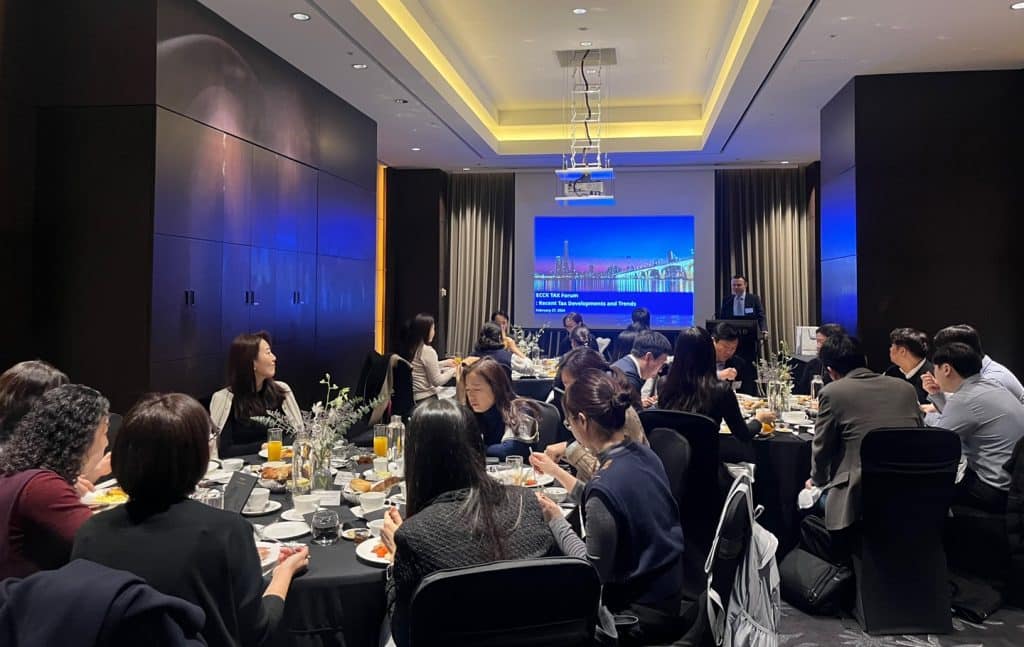 The session was led by Maria Chang and Eunhong Lee from Bae, Kim & Lee, providing guidance to foreign invested companies on how to navigate complex tax environment in Korea. Topics included recent tax law amendments, risk identification through selected tax cases and tax refund opportunities. We would like to sincerely thank BKL for this valuable session.