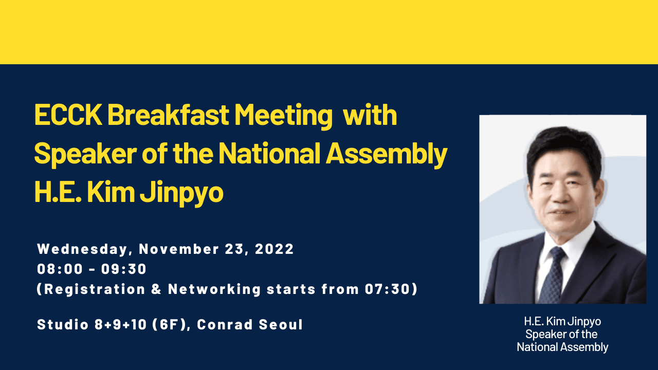 The European Chamber of Commerce in Korea (ECCK) would like to invite you to attend the ECCK Breakfast Meeting with Speaker of the National Assembly of the Republic of Korea H.E. Kim Jinpyo scheduled for Wednesday, November 23, 2022, taking place at Studio 8+9+10, Conrad Seoul. At the meeting, H.E. Kim Jinpyo will share his valuable insights and views on the developmental relationship between Korea and Europe.