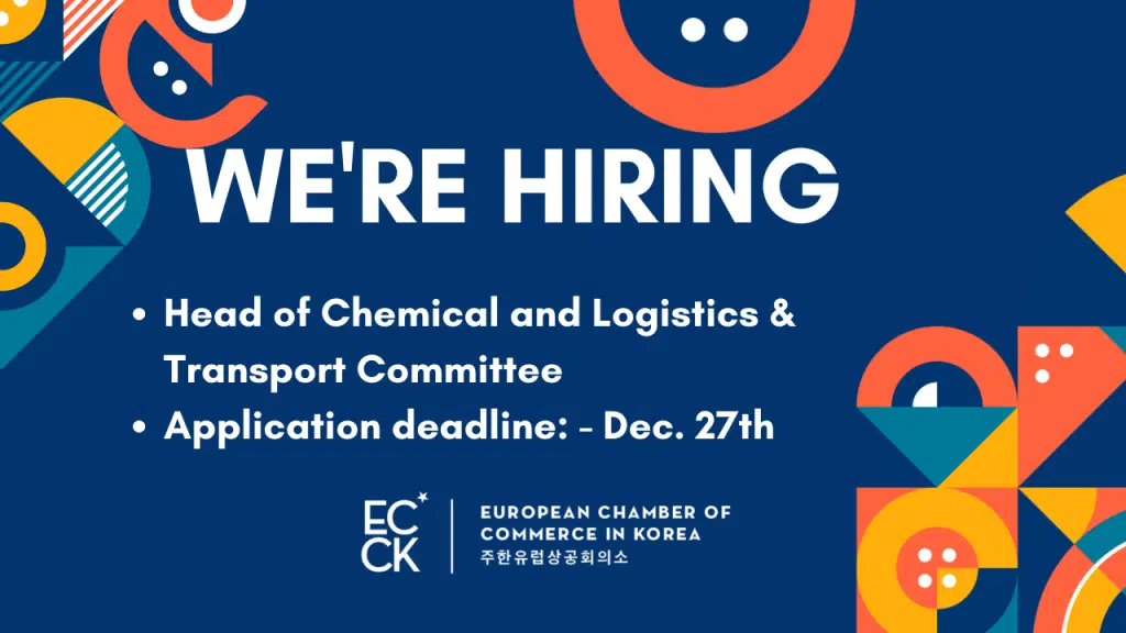 Title: Head of Chemical and Logistics & Transport Committees Location: European Chamber of Commerce in Korea, Seoul Office Contract type: Permanent Application Deadline: December 27, 2023 Job Description Managing Chemical Committee and Logistics & Transport Committee activities and relationship with counterparties. Updating industry regulation and news to Committee members. Addressing position papers (incl. agenda of ECCK White Paper) to Korean government and related agencies. Organizing regular committee meetings and ad-hoc meetings / events. Other tasks as instructed by the ECCK President and the management decision making. Requirements Fluent in Korean and English (both oral and written), certified language test score(s) a plus; Knowledge and 1~2 years of experience in chemical industry and regulatory affairs preferred; Good research & analytical skills and capacity to summarize relevant information; Excellent communication skills (both oral and written); Proficiency in using MS Office; Organised, proactive, and self-confident. Application Procedure Please send your application by email to career@ecck.or.kr by 27. Dec. (Wed) 2023, 24:00 KST Application should follow the below Email Title: Chemical_Name Cover letter in English & Korean (max. 1 page each) CV in English & Korean (max. 1 page each) All documents to be combined into 1 pdf file for the submission * Late or incomplete applications will not be considered. * Only successful candidate shall be reached out for interview process