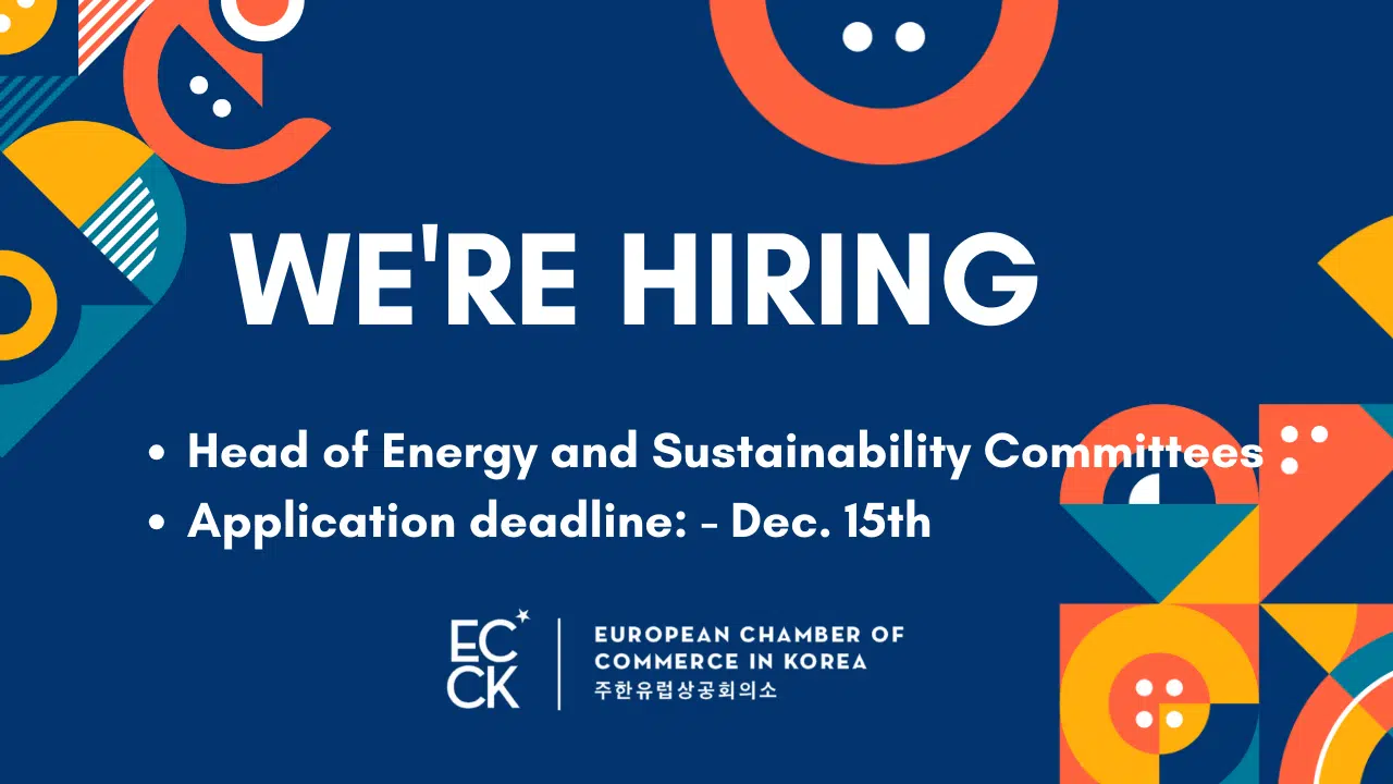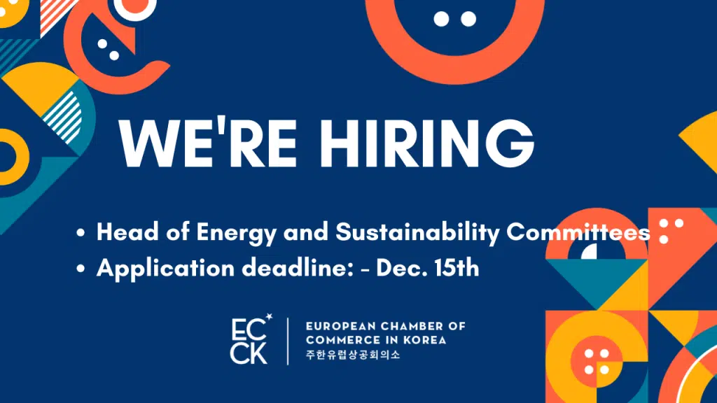 Title: Head of Energy and Sustainability Committees (Assistant Manager) Location: European Chamber of Commerce in Korea, Seoul Office Contract type: Permanent Application Deadline: December 15, 2023 Job Description Engaging with key Korean, European, and international counterparts to address and resolve business challenges of members. Gathering industry contributions and drafting formal position papers. Devising and operating activities according to member needs (including Committee meetings, seminars, and conferences). Contribution to the general operation of the ECCK. Follow up on the EU-Korea FTA on industries and monitor current relevant regulations and media coverage. Requirements Minimum of two years of relevant professional experience. Knowledge of Energy, Sustainability, and Tourism. Familiarity with Korean legislation and legislative process. Fluency in English with valid proven records (both oral and written) Excellent research & analytical skills and capacity to summarize relevant information. Outstanding writing and communication skills. Proactive and able to work independently, sometimes under tight deadlines. Flexible and able to work on multiple projects at any one time. International mindset, comfortable working in a multi-national environment. Proficiency in using MS Office and Hansoft. Application Procedure Please send your application by email to career@ecck.or.kr by 15. Dec. (Fri) 2023, 24:00 KST Application should follow the below Email Title: Energy + Sustainability_Name_Name Cover letter in English & Korean (max. 1 page each) CV in English & Korean (max. 1 page each) All documents to be combined into 1 pdf file for the submission * Late or incomplete applications will not be considered. * Only successful candidate shall be reached out for interview process