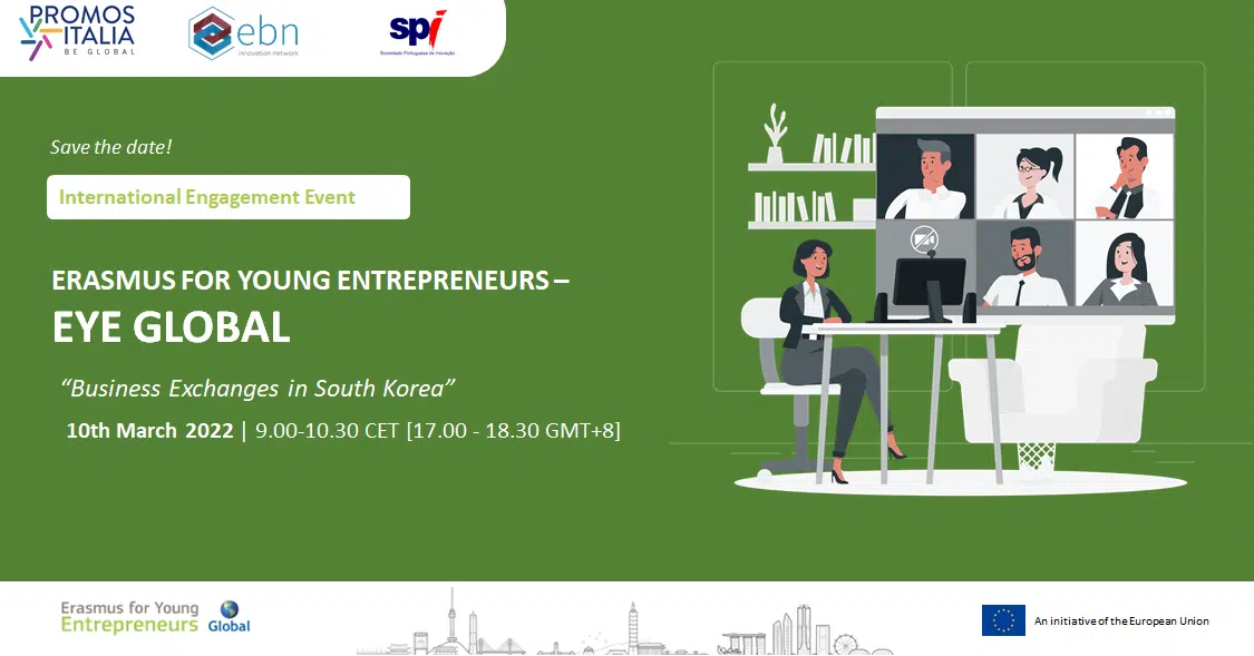 Erasmus for Young Entrepreneurs (EYE) Global is an initiative of the European Commission and an exchange program, which gives experienced entrepreneurs based in Canada, Israel, Singapore, South Korea, Taiwan and the USA the opportunity to collaborate with new or aspiring entrepreneurs from the European Union.