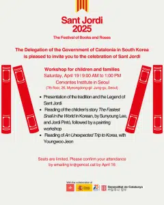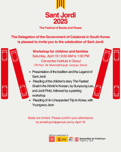 As part of the celebration of Sant Jordi Day, the Delegation of the Government of Catalonia in South Korea also invites you to the Festival of Books and Roses — a workshop for children and families to participate in activities and experience the vibrant culture of Catalonia.