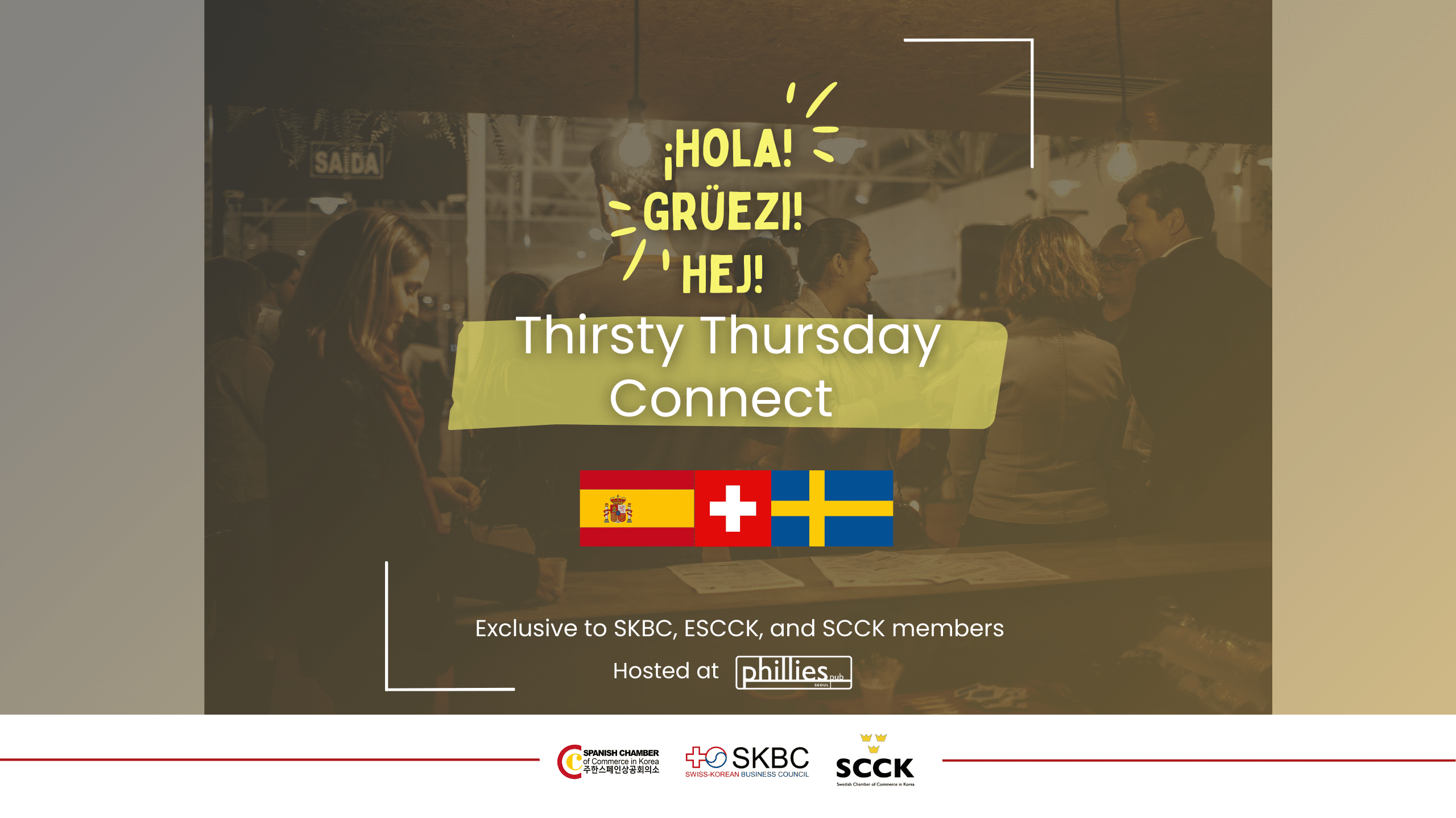 The Spanish Chamber (ESCCK), the Swiss Korea Business Council and the Swedish Chamber (SCCK) are teaming up for Thirsty Thursday Connect – a relaxed joint networking evening for the three communities.