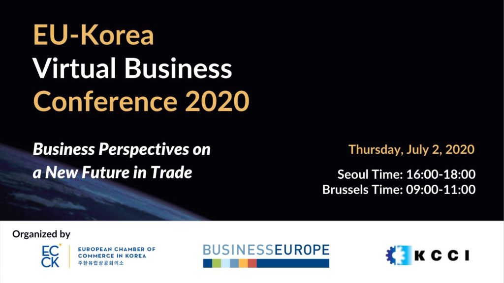 ECCK, in cooperation with Korea Chamber of Commerce and Industry and BusinessEurope, is organizing ‘EU-Korea Virtual Business Conference 2020’ on July 2. For more information about the conference, please click here to download the event program.